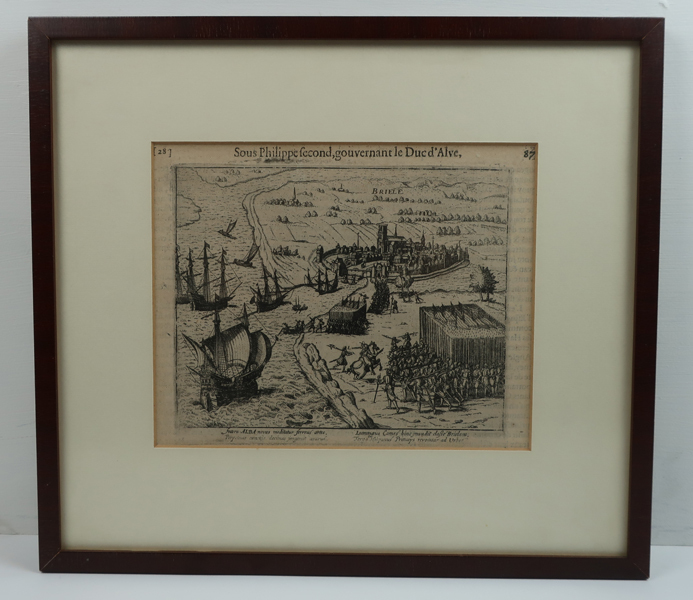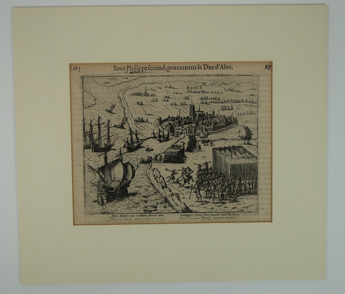 Prent, met voorstelling van de Inname van Brielle. In het midden rechts de vestingstad Den Briel aan de Maas. Links de rivier de Maas met daarop vijf schepen die richting Brielle varen. Op het land onder Brielle vormen twee groepen van hellebaardiers en piekeniers een carré. Onder voorstelling een opschrift in het Latijn.
