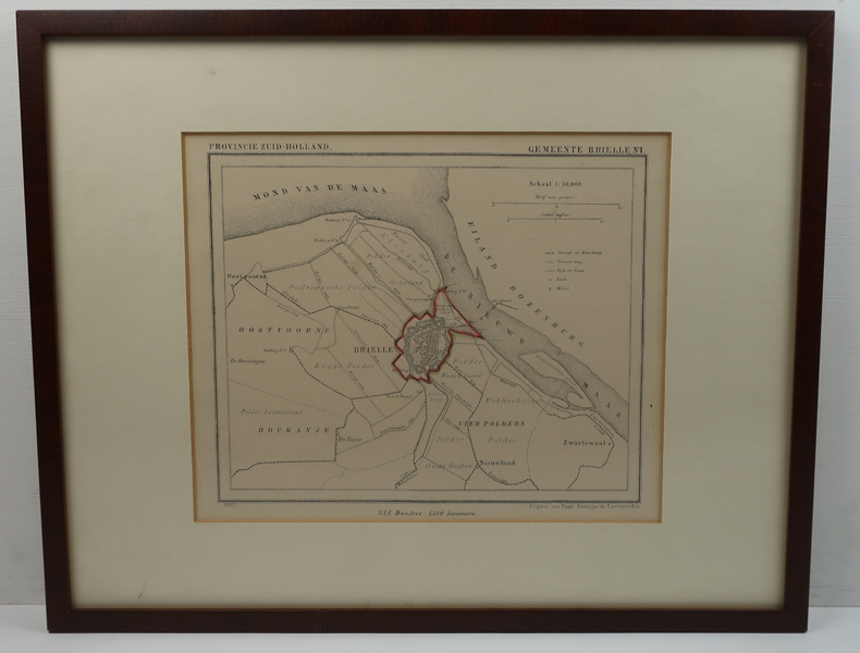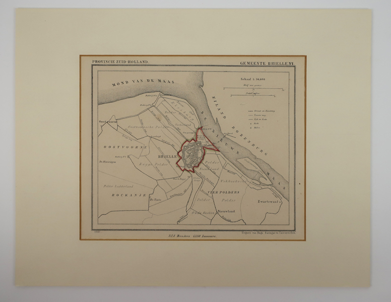 Prent, zijnde een kaart van Brielle met omliggende polders van Voorne. In het midden Brielle gearceerd met een rode stift. Rechtsboven wordt de schaal aangegeven. Rondom worden verschillende polders aangegeven waaronder: Meeuwenoordsche polder, Kleiburg, Polder oosterland, Oostvoornse Polder, Rockanje met Polder lodderland, Oostvoorne met Rugge Polder, Polder Oude gooten, Vierpolders met Polder Nieuwland, Vekhoeksche Polder ...