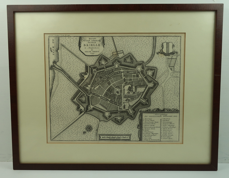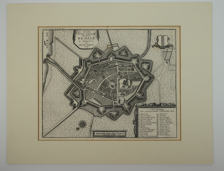 Prent, zijnde een kaart van Brielle, getiteld: 'Nieuwe Grond-tekening der stad Brielle. In het midden de vesting Brielle waarin diverse gebouwen en kerken worden aangeven. Rechtsonder de legenda waarin de gebouwen omschreven worden zoals: stadhuis, Groote Kerk (Sint-Catharijnekerk), Maarlandse Kerk, Franse kerk, Remonstrantse Kerk, Roomse Kerk, De Doelen, Hoofdwacht, Weeshuis, Pesthuis, Latijnse school en diverse ...