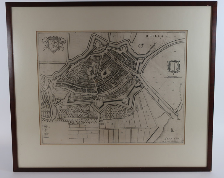 Prent, kopergravure met kaart en plattegrond van Brielle getiteld: 'BRIELLA'. Op de voorgrond de kaart van Brielle met daaromheen de omliggende polders. Linksboven een gekroond wapen. Rechts het wapen van Brielle met daaronder aangegeven de schaal van 50 roeden. Linksonder de legenda waar gebouwen worden beschreven zoals o.a. het stadhuis, de Kerck (Sint-Catharijnekerk), gasthuis, Langestraat, ...