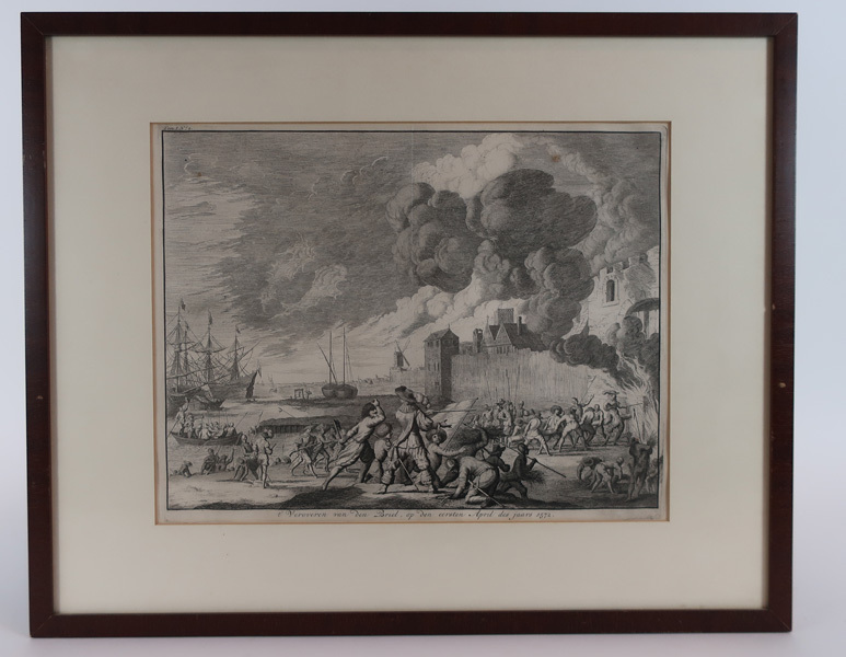 Prent, ets, met de inname van Den Briel getiteld: 't Veroveren van Den Briel, op den eersten April des jaars 1572. Op de voorgrond zijn de Watergeuzen afgebeeld die bezig zijn de toegangspoort van Brielle te rammen. UIt die poort komt vuur en rook. Aan de linkerkant zijn schepen afgebeeld. Aan de rechterkant wordt de ...