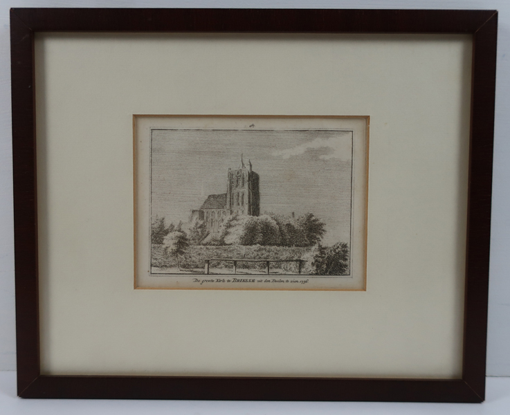 Prent, kopergravure met gezicht op de Sint-Catharijnekerk getiteld: De groote kerk te Brielle uit den Doelen te zien 1736. Op de achtergrond een gedeelte van de Sint-Catharijnekerk. Daarvoor bossages en deel van de vestingswal. Voor de vestingswal een hek. Opschrift onder voorstelling.