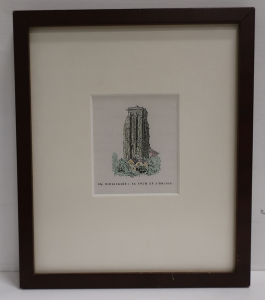 Prent, getiteld: 'ZIERICKZÉE : LA TOUR DE L'EGLISE. met gekleurde voorstelling van de Nieuwe Kerk te Zierikzee. Onder de toren van de kerk een aantal huizen en bossages.