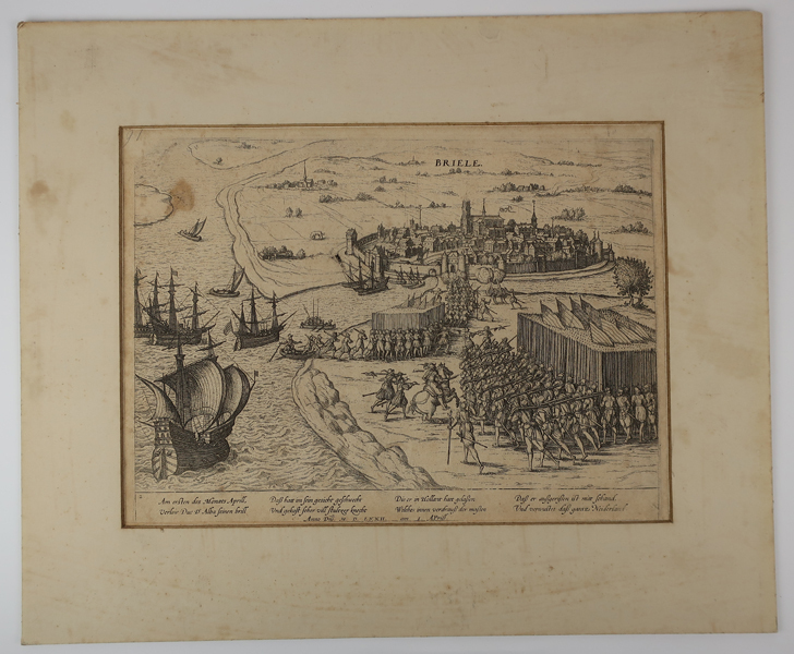 Prent, met voorstelling van de inname van Den Briel op 1 april 1572. Linksonder varen de watergeuzen op schepen en roeibootjes richting de haven van Brielle. Middenrechts staan de watergeuzen in carré klaar om de stad Brielle in te nemen. Op de achtergrond de vesting van Brielle. Met kanonnen wordt al op de poort geschoten.
