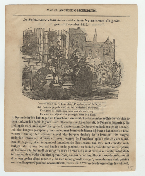 Prent uit 'Vaderlandsche Geschiedenis' getiteld: 'De Brielenaars slaan de Fransche bezetting en nemen die gevangen. 1 December 1813'. Onder titel voorstelling met rechts de Briellenaren die de Fransen aanvallen. Links staan de Fransen met geweren op het bordes van stadhuis. Van achter worden zij aangevallen door enkele Brielenaren met geweren. Onder voorstelling een gedicht en ...