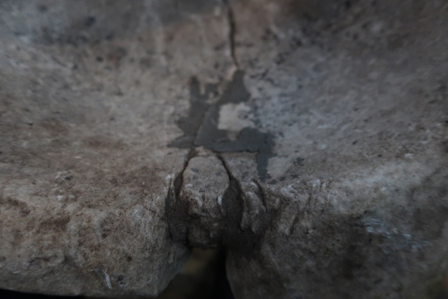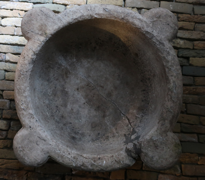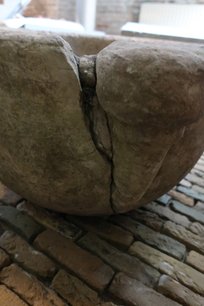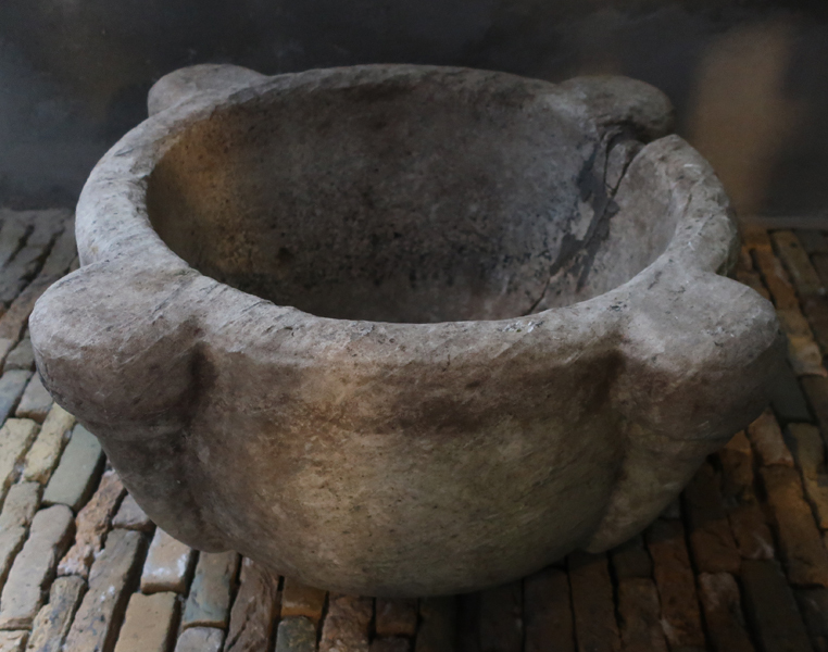 Grote ronde marmeren vijzel met vier uitstulpingen aan de buitenkant. Vijzel heeft wat betreft uiterlijk iets weg van een doopvont maar is in dit geval gebruikt door een apotheker. De binnenkant is ruw, mogelijk voor het vermalen van planten en kruiden.