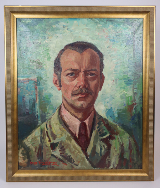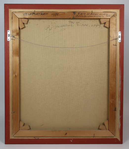 Schilderij, olieverf op doek, met zelfportret van Piet Middelhoek (1930-2004). Portret ten halve lijve. Lichaam en hoofd frontaal. Kijkt beschouwer en face aan. Man draagt een snor, draagt een groenkleurige jas met daaronder een rood/roze overhemd met stropdas. Portret tegen een groen/blauwe achtergrond. Gesigneerd en gedateerd linksonder. Schilderij in goudkleurige geprofileerde lijst. Tevens gesigneerd op ...