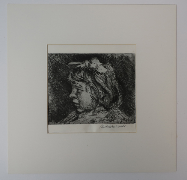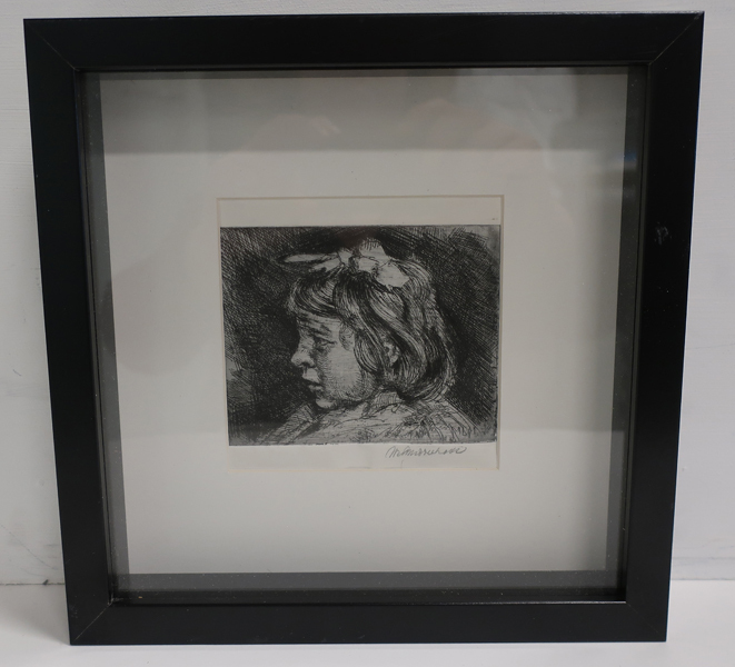 Prent, ets met portret van een jong meisje. Lichaam en hoofd van meisje naar rechts gedraaid. Meisje heeft een strik in haar halflange haar. Gesigneerd rechtsonder.