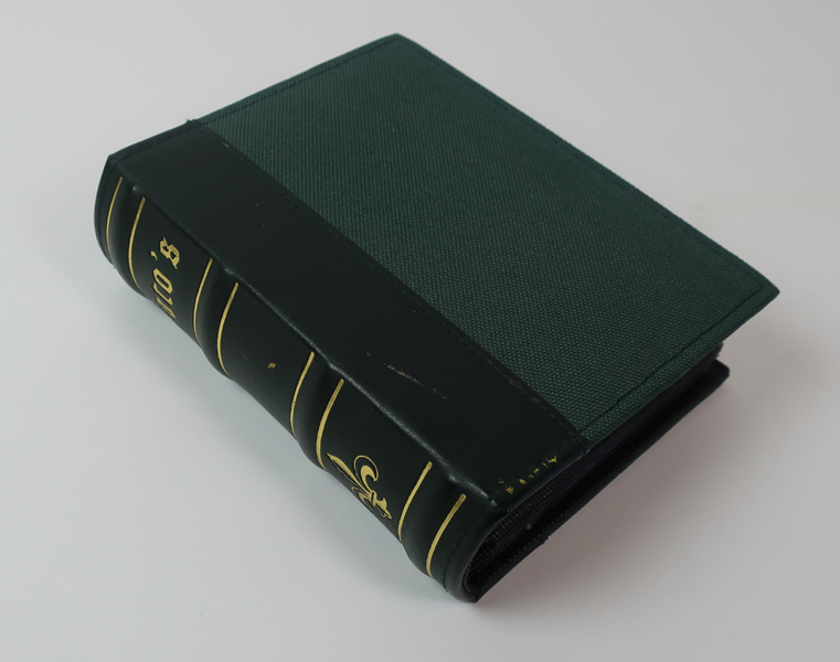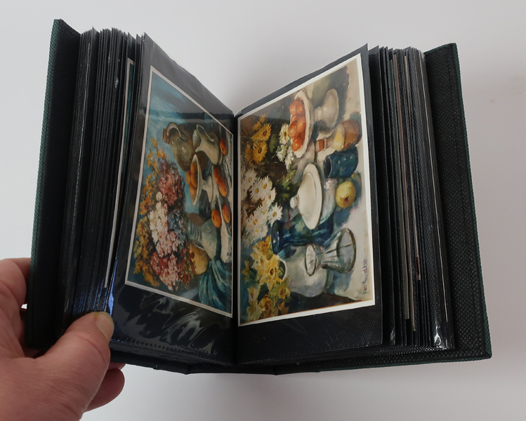 Fotoalbum, klein donkergroen boekje, deel van de voor- en achterkaft is van stof, rug is van kunstleer. Opschrift 'foto's' op bovenkant rug met daaronder een goudkleurige Franse lelie. In het fotoalbum zitten foto's van schilderijen die door kunstenaar Piet Middelhoek (1930-2004) zijn vervaardigd. Er zitten foto's in van abstract werk, gezichten op Brielle en stillevens.