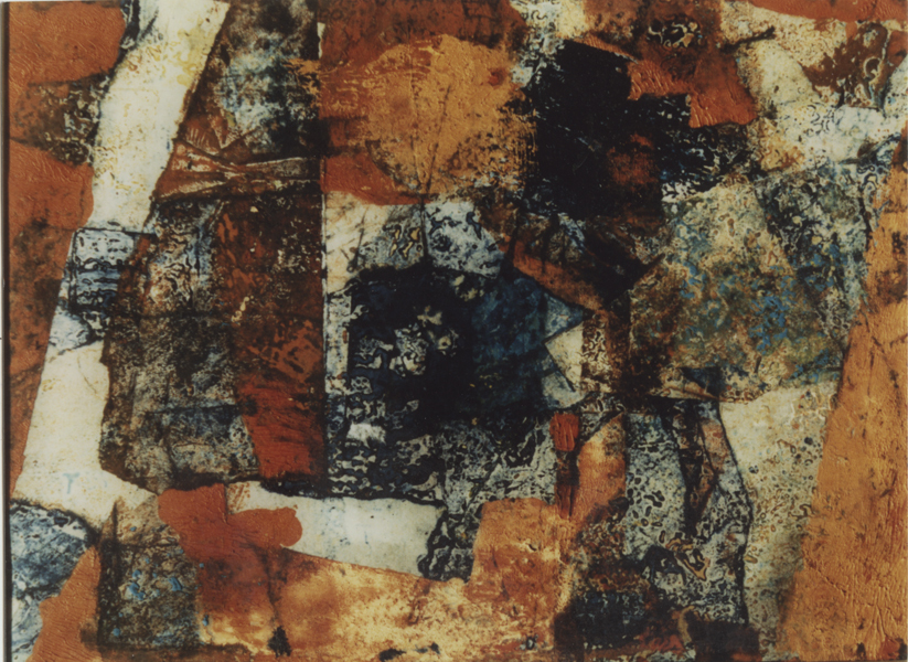 Foto, kleur, van een schilderij van kunstenaar Piet Middelhoek (1930-2004). Foto van een abstract werk in de kleuren, oker, zwart en wit.