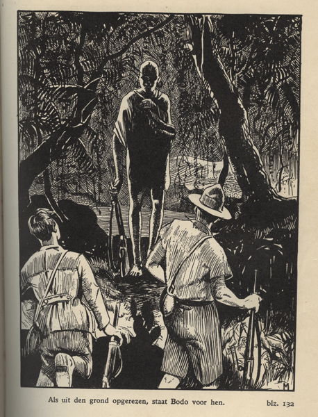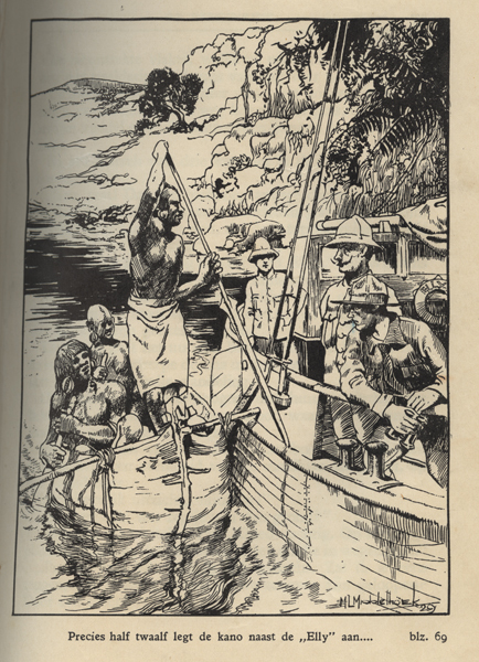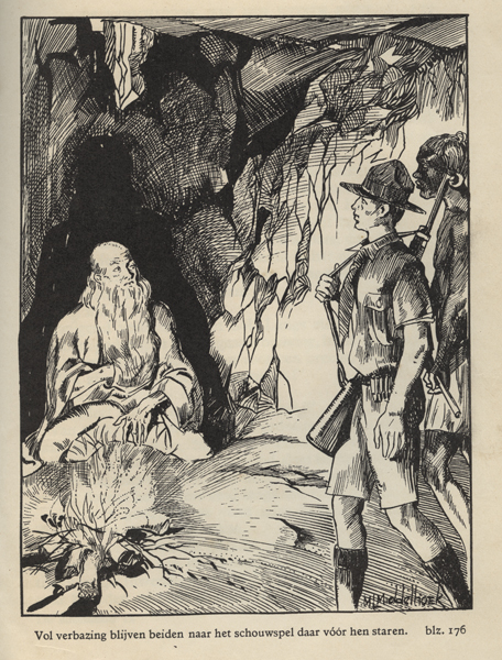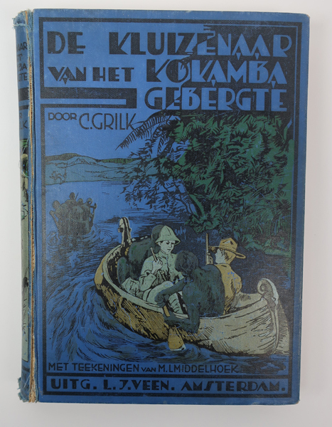 Boek zijnde een jeugdboek getiteld: 'De kluizenaar van het kokambagebergte'. Op de blauwe voorkaft een afbeelding van een aantal personen in een kano of boot. Rechts van de boot bossages. Voor de voorste kano varen ook een aantal personen in een boot. In het boek diverse afbeeldingen die geïllustreerd zijn door M.L. Middelhoek.