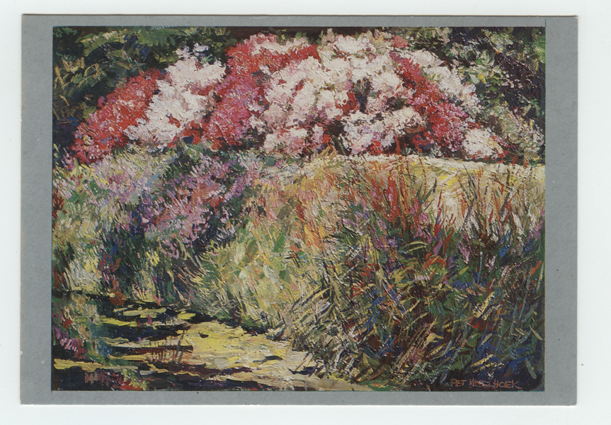 Ansichtkaart, 120 stuks, met daarop een door Piet Middelhoek (1930-2004) geschilderd tuinlandschap. Tuinlandschap met linksonder een stuk van vijver. Aan de oever begroeiing en gras. Geheel boven zicht op roze en witte bloeiende rhododendrons. Landschap tegen een grijze achtergrond. Opschrift op achterkant. Titel van origineel schilderij is Rhododendrons speciaal.