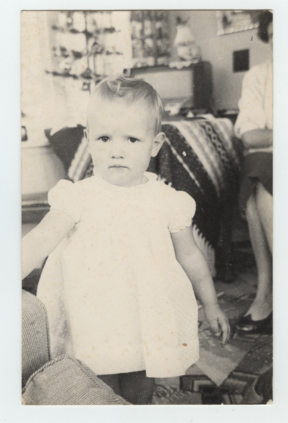 Foto, zwart/wit, met portret van Marga een tweejarig meisje. Op de voorgrond een jong meisje, draagt een wit jurkje met korte mouwen, haar korte haar in een lichte kuif. Op de achtergrond een tafel met daarop een radio.