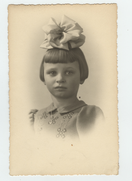 Foto of ansichtkaart, zwart/wit, met protret van jong meisje. Meisje heeft een grote lichte strik in haar haar en draagt haar haar in een bobline. Rand van ansichtkaart is gekarteld.