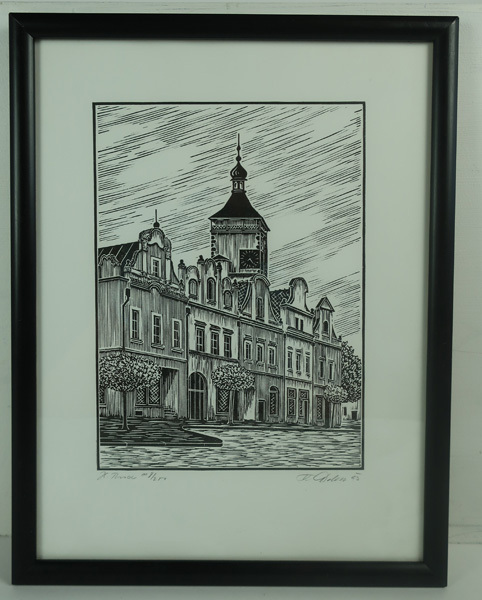 Prent met gezicht op Havlíčkovo nám (plein) te Havlíčkův Brod in Tsjechië . Op de voorgrond vijf gebouwen met verschillende klokgevels. Op de achtergrond steekt een toren uit. Gesigneerd en gedateerd rechtsonder. Prent zit in een dunne, zwarte lijst.