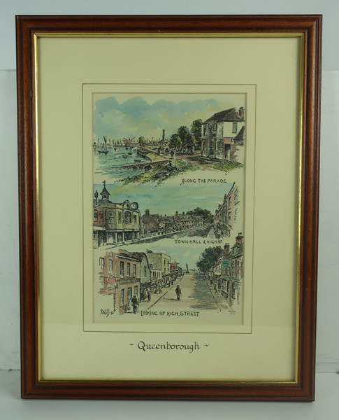 Prent, lithografie, met drie gezichten op Queensborough allen met onderaan een opschrift in het Engels. Bovenaan gezicht langs de parade. In het midden gezicht op het stadhuis en de Hoofdstraat. Onderaan gezicht op de Hoofdstraat. Gesigneerd linksonder in prent. Opschrift onderaan op passe-partout. Prent zit in een smal, geprofileerde lijst met goudkleurige binnenrand en is ...