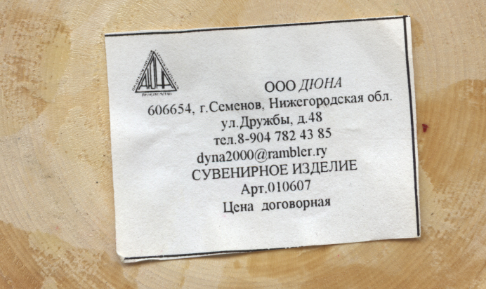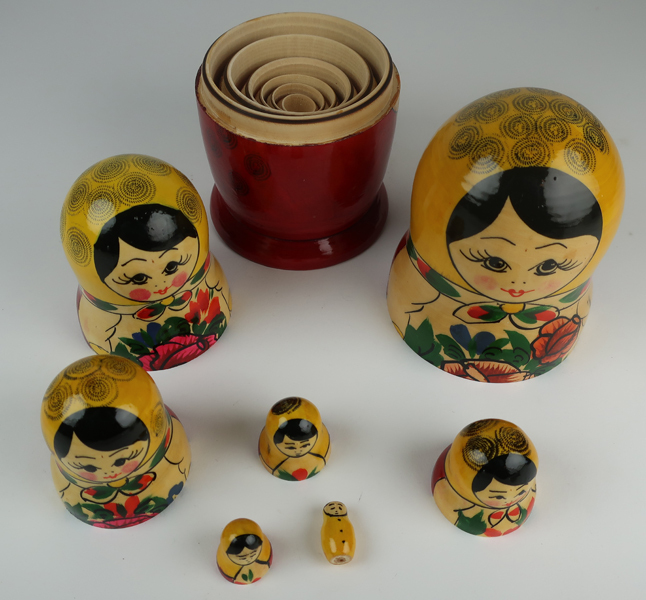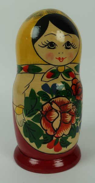Matroesjka bestaande uit zeven poppen. Zes popen om uit te schuiven en één pop, geel, in vorm van een kleine kegel. De pop is aan de bovenkant geel en onderkant rood. Aan voorkant een schort met florale motieven in de kleuren rood en groen. Etiket aan onderkant.