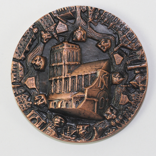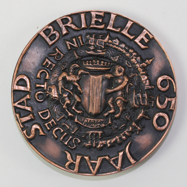 Gedenkpenning, brons t.g.v. 650 jaar stad Brielle. Op voorzijde gemeentewapen van Brielle gehouden door staande cerberus en griffioen van de heerlijkheid Voorne, omgeven door het silhouet van de stad Brielle met scheepjes en opschrift. Met wapenspreuk en rondschrift. Op keerzijde voorstelling in hoog reliëf van Catharijnekerk in de door water omringde vesting met negen bastions, ...