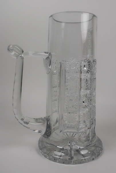 Hoge, drinkglas zijnde een bierpul voorzien van een groot handvat in facet geslepen. Het glas is voorzien van gegraveerde arceringen en geometrische patronen. Op de voorkant boven een gegraveerde stadswapen van Havlíčkův Brod. Op de rand van voet inscriptie 'Havlíčkův Brod 1996'.