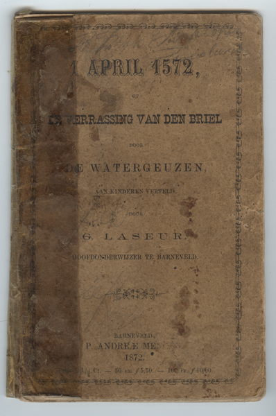 Boekje getiteld: '1 April 1572 of de verrassing van Den Briel door de Watergeuzen, aan kinderen verteld door G. Laseur, hoofdonderwijzer te Barneveld. Inhoud boekje gaat over de Tachtigjarige Oorlog en de inname van Brielle met de hoofdstukken: Prins Willem van Oranje, De pogingen van den Prins van Oranje, om de Spanjaarden te verdrijven, mislukt., ...