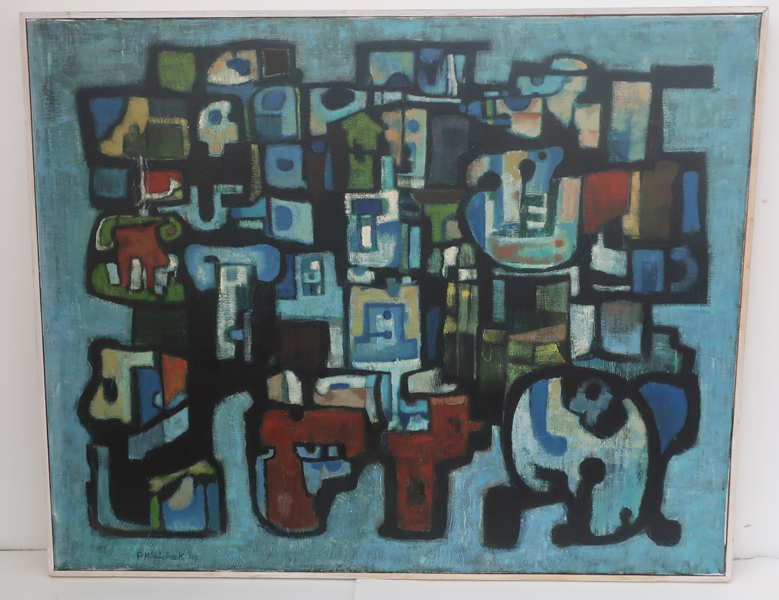 Schilderij, olieverf op linnen, met abstract werk genaamd 'Schakeling'. Abstract werk bestaat uit geschakelde geometrische vormen. Enkele zijn groen en rood gekleurd. Enkele hebben de kleur van de achtergrond. Het geheel tegen een licht blauwe achtergrrond. Gesigneerd en gedateerd linksonder. Schilderij in smal, witte houten lijst.