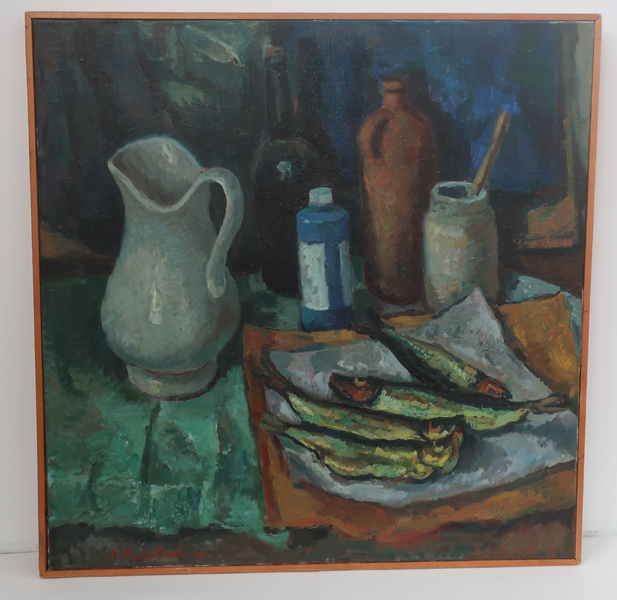 Schilderij, olieverf op linnen, met stilleven getiteld:'Stilleven met witte kan en bokkingen'. Op de voorgrond rechts een platte schaal met daarop vier bokkingen. Links daarvan een witte kan op een groen kleed. Achter de schaal een bruine kruik, een hoge fles, een blauwe fles en een pot met gereedschap. Sitlleven tegen een blauwzwarte achtergrond. Gesigneerd ...