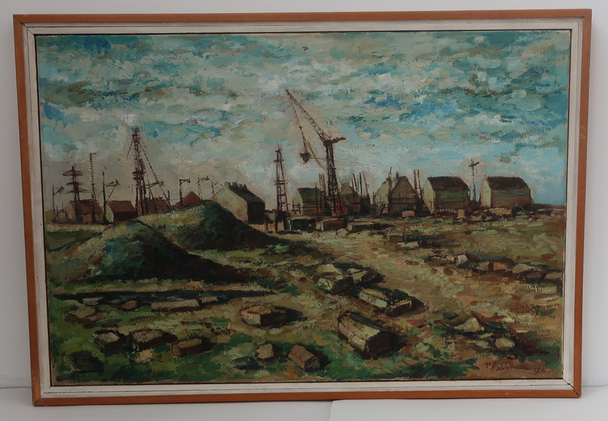 Schilderij, olieverf op linnen, getiteld: 'Rugge in aanbouw' te Brielle. Op de voorgrond een stuk braakliggend terrein met links twee bulten grond. Op de achtergrond huizen in aanbouw met daarnaast diverse heiskranen. Geheel tegen een blauw met witte lucht. Gesigneerd en gedateerd rechtsonder. Schilderij in dubbele, witte en houten lijst.