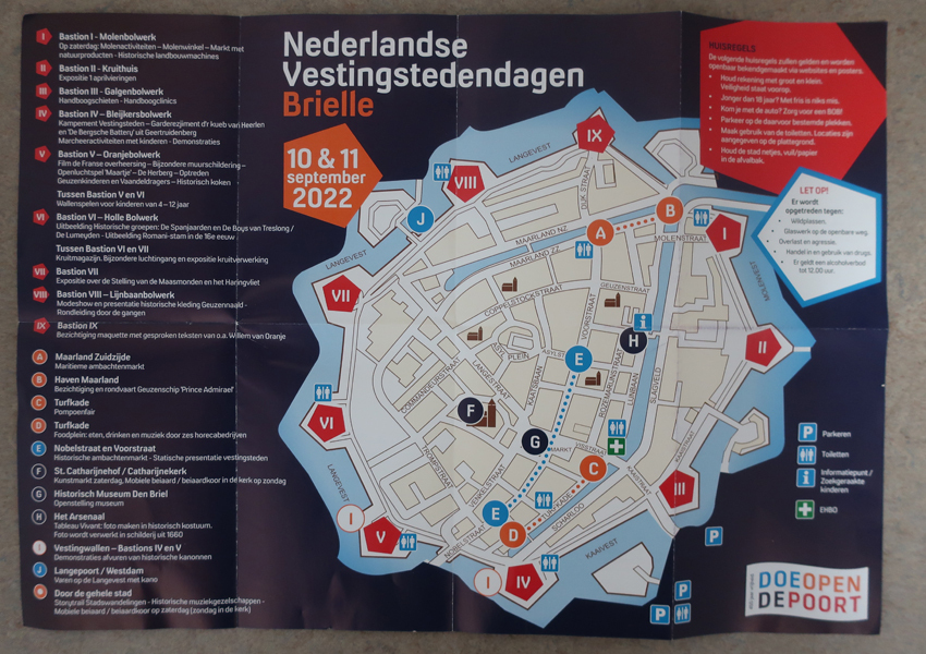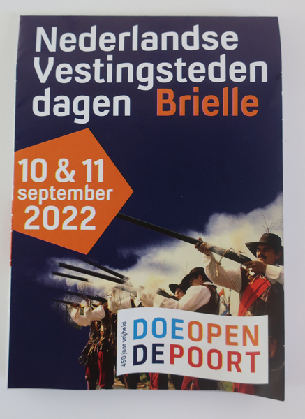 Plattegrond met programma van de Nederlandse Vestingstedendagen Brielle gehouden op 10 en 11 september 2022. De binnekant bestaat uit een kaart of plattegrond van Brielle met o.a. genummerde bastions. Links een korte beschrijving per bastion, straat of gebouw met wat er te doen is. Op de achterkant een uitgebreide omschrijving van wat er te doen ...