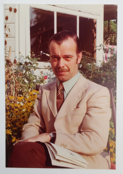 Foto van Piet Middelhoek (1930-2004) zittend in een tuin. Man draagt een lichtgekleurde jas met witte overhemd en bordeaux kleurige stropdas en broek. Zijn haren zijn achterover gekamt en hij draagt een snor. Op zijn schoot een tijdschrift of een boek.