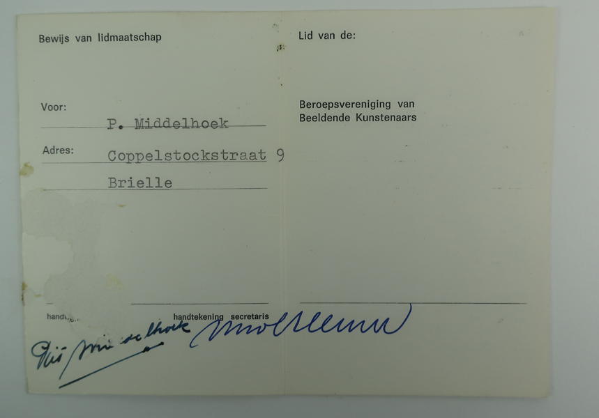 Pas voor lidmaatschap van Nederlandse federatie van beroepsverenigingen van kunstenaars van Piet Middelhoek (1930-2004) 1973. Voorkant voorzien van deels rode letters. In binnenkant gegevens van Piet Middelhoek en voorzien van handtekening.