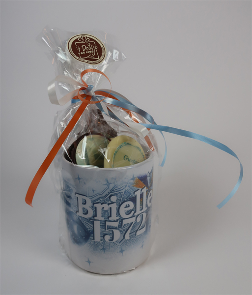 Drinkerbeker met opschrift: 'Brielle 1572'. Op de achtergrond in blauwgrijs gedrukt een voorstelling van een Spaanse helm, vesting Brielle, Sint Catharijnekerk met daarvoor de Geuzenvlag. Rechtsonder de herdenkingsspreuk van 450 jaar vrijheid 'Doe Open De poort'. linksonder het logo van Stichting Brielle 2022. In de beker zit diverse chocolade afkomstig van 't Doosje van Lobs. ...