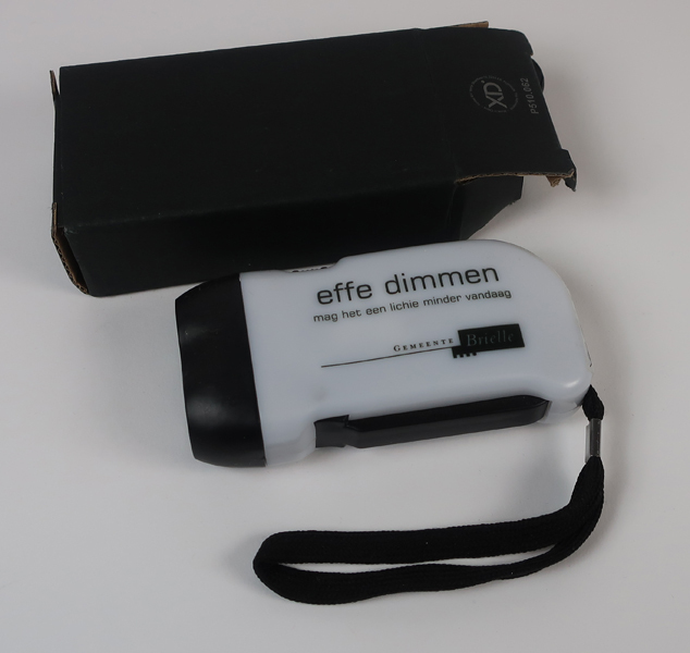 Zaklamp, zwart/wit met logo Gemeente Brielle in het zwart. Op één zijkant opschrift: 'effe dimmen / mag het een lichie minder vandaag'. Zaklamp kan ook gebrukt worden als knijpkat. Aan de achterkant een zwart koord om zaklamp vast te houden. Zaklamp met zwart bijbehorende doosje en gebruiksaanwijzing.