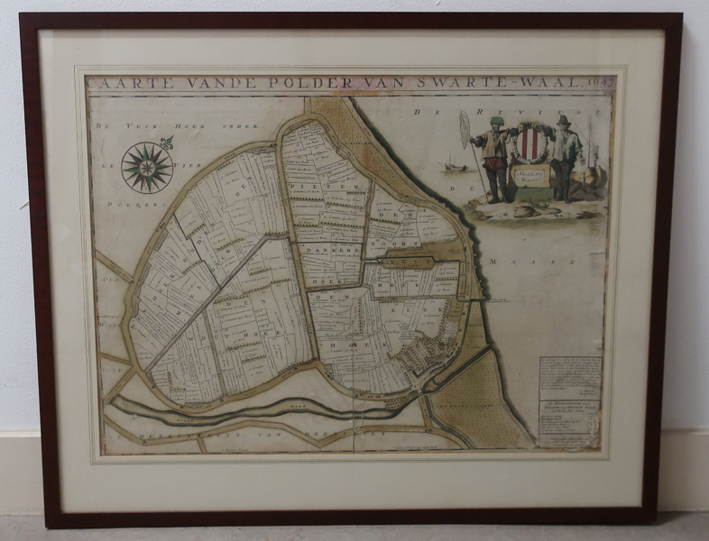 Kaart, kopergravure, van de polder van Zwartewaal. Op de voorgrond de polder van Zwartewaal opgedeeld in rechthoekige percelen bestaande uit Pieter dankers hoek, Noortwest hoek, Den Kerkhoek, Den Wout hoek en Den hoek onder den Meeldyck. De polders zijn gemeten in Roen. Geheel onder de Holle Mare die rechtsonder uitmond in het dorp Zwartewaal. Rechtsboven ...