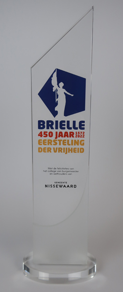 Gedenkglas of glazen object, bestaande uit een smal, hoog, schuin afgesneden stuk glas op glazen ovalen voet. Bovenaan doorzichtige afbeelding van de vrijheidsnimpf tegen blauw kader. Daaronder opschriften: 'Brielle 450 jaar 1572-2022 eersteling der vrijheid', 'Met de felicitaties van het college van burgemeester en wethouders van Gemeente Nissewaard'.