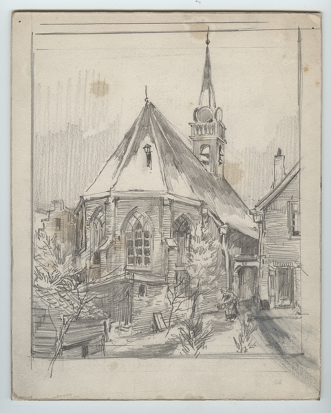 Tekening, grijs potlood op karton, met gezicht op Jacobskerk te Brielle. Op de voorgrond een tuin met gezicht op de achterkant van het schip van de Jacobskerk. Op de achtergrond de toren gelegen aan de Voorstraat te Brielle.