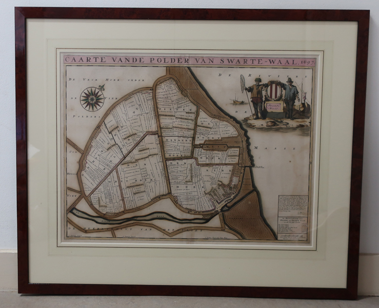 Kaart, kopergravure, van de polder van Zwartewaal. Op de voorgrond de polder van Zwartewaal opgedeeld in rechthoekige percelen bestaande uit Pieter dankers hoek, Noortwest hoek, Den Kerkhoek, Den Wout hoek en Den hoek onder den Meeldyck. De polders zijn gemeten in Roen. Geheel onder de Holle Mare die rechtsonder uitmond in het dorp Zwartewaal. Rechtsboven ...
