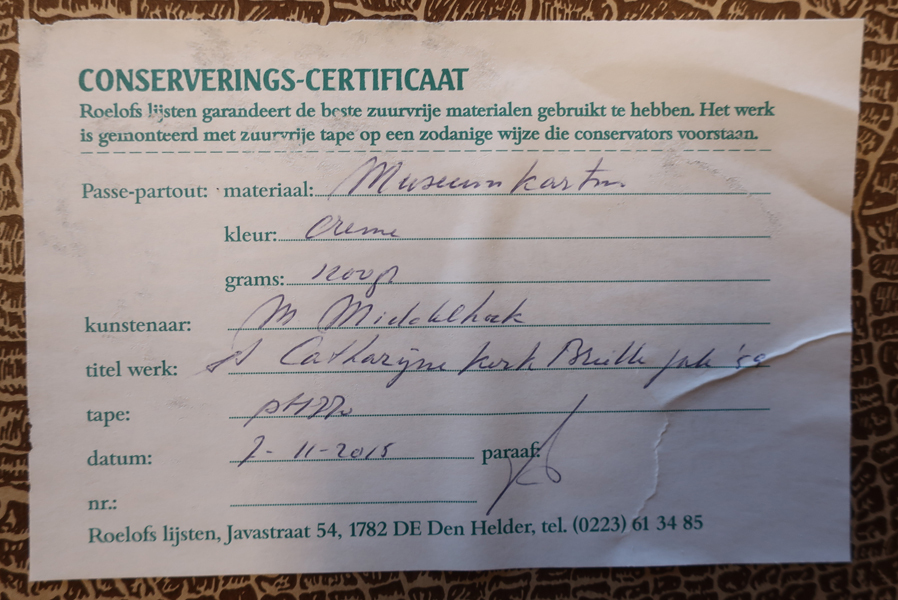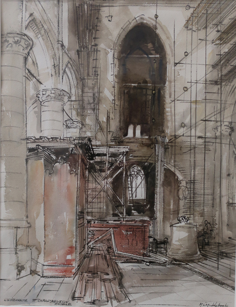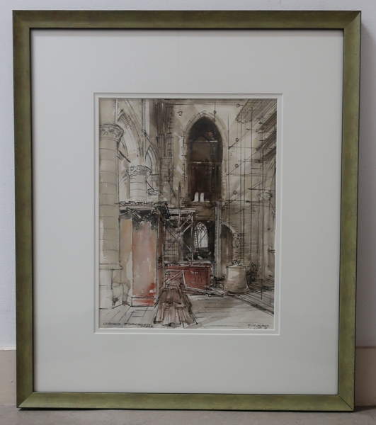 Aquarel, met voorstelling van het interieur van Sint Catharijnekerk tijdens de restauratie in 1959. Links de zuilenrij van de kerk, deels in steigers. Op de grond liggen steigerplakken. Het rechtergedeelte van de kerk staat ook in steigers. Op de achtergrond staat een klok op de grond. Gesigneerd en gedateerd rechtsonder. Aquarel in passe-partout en groen/beige ...