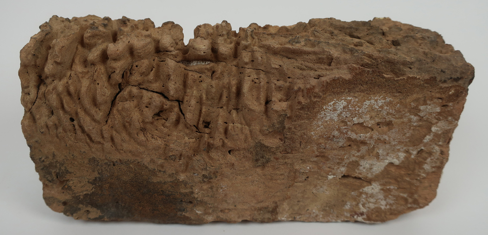 Steen, rood bakkend, zijnde een aanvliegsteen voor duiven. Steen gevonden tijdens restauratie van Sint Catharijnekerk in de jaren 1950-1960.