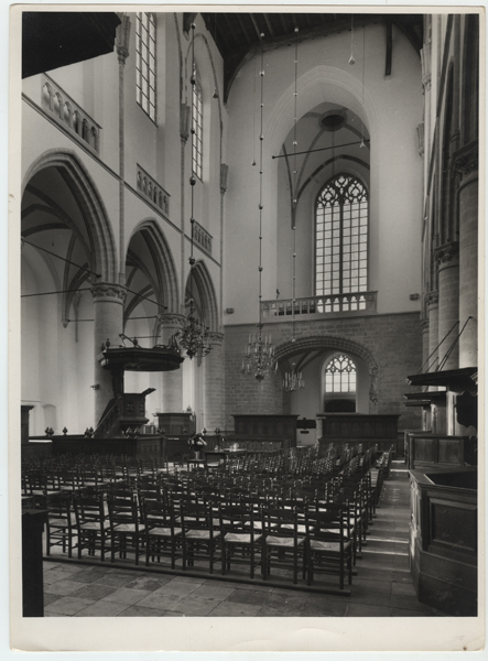 Foto, zwart/wit, van interieur van de Sint Catharijnekerk. De foto is waarschijnlijk gemaakt na de restauratie van Sint Catharijenerk 1950-1960.