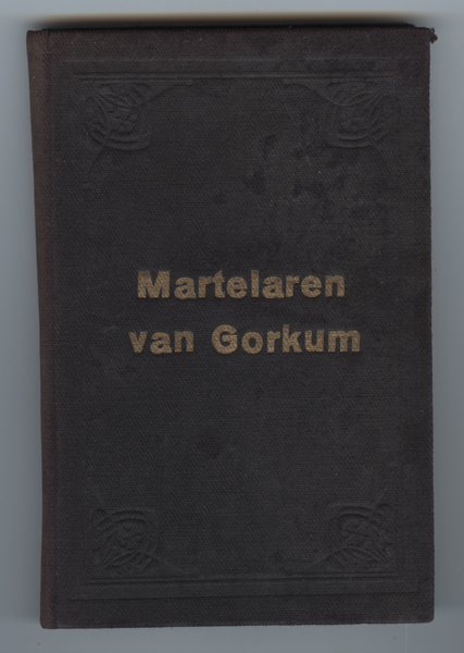 Klein boekje getiteld: Martelaren van Gorcum. Titel titelpagina 'Godvruchtige oefeningen ter eere der HH. XIX Martelaren van Gorkcum. Boekje heeft een donkerblauwe kaft, goudkleurige opschrift binnen versierd kader. Boekje bestaat uit de geschiedenis van de martelaren, novenen, gebeden en gezangen