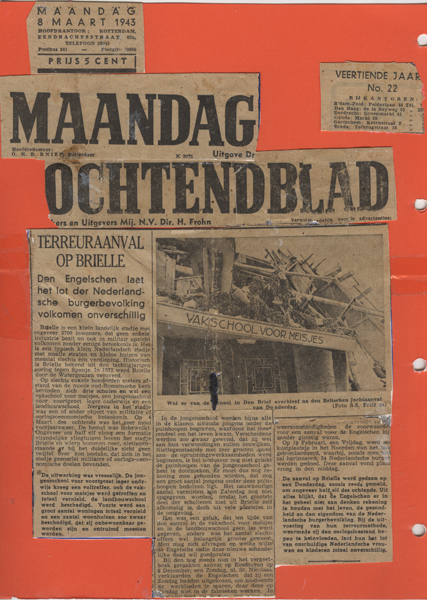 Krantenarikel over bombardement Brielle 4 maart 1943. Krantenarikel zit geplakt op oranje papier.