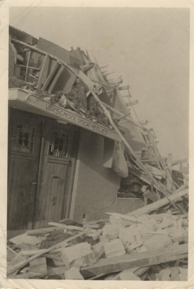 Foto, zwart/wit na bombardement Brielle 4 maart 1943. Foto met ingang van ingestorte ingang van Vakschool voor Meisjes. Foto heeft wit geschulpte rand en zit geplakt op wit karton. Foto is door een Duitse soldaat gemaakt.