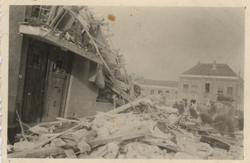 Foto, zwart/wit na bombardement Brielle 4 maart 1943. Foto van ingestort Vakschool voor Meisjes. Foto heeft wit geschulpte rand en zit geplakt op wit karton. Foto is door een Duitse soldaat gemaakt.