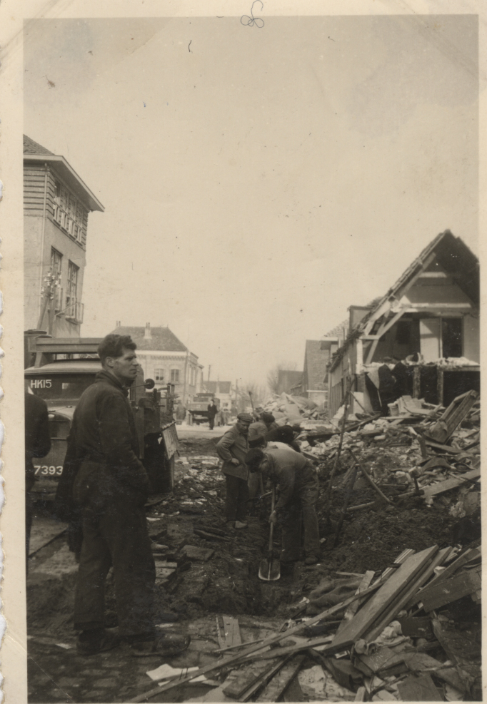 Foto, zwart/wit na bombardement Brielle 4 maart 1943. Foto van ingestorte gebouwen en puin in de Langestraat. Links een vrachtwagen. Daarvoor staat een man in overal. In het midden graven mannen in grond. Foto heeft wit geschulpte rand en zit geplakt op wit karton. Foto is door een Duitse soldaat gemaakt.