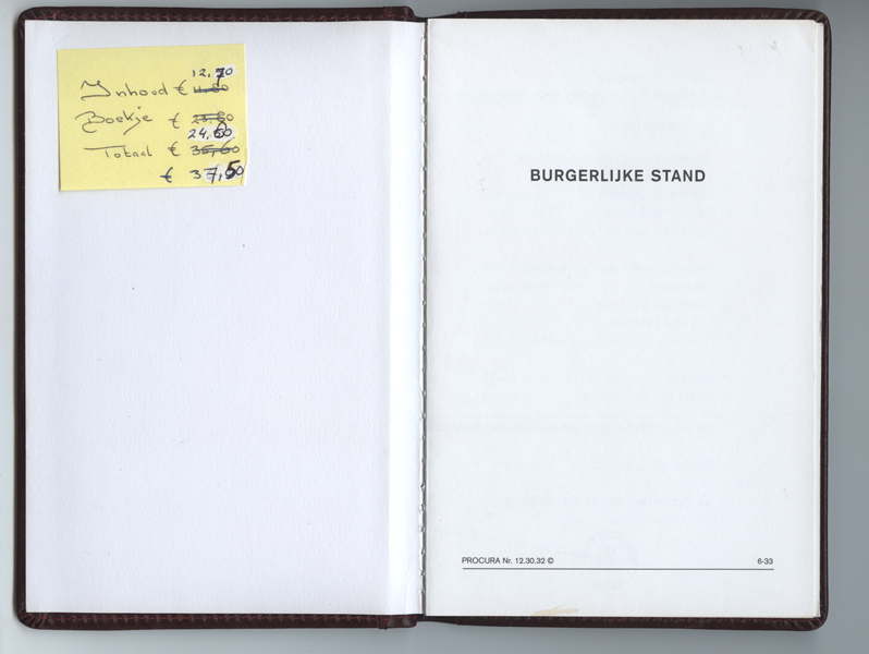 Trouwboekje, bordeauxrood, met op de voorkant goudkleurig wapen en opschrift van Gemeente Brielle. Op binnenkant voorkaft een gele memo met prijzen. In het midden de namen van een echtpaar samen met de ambetenaar van de burgelijke stand.