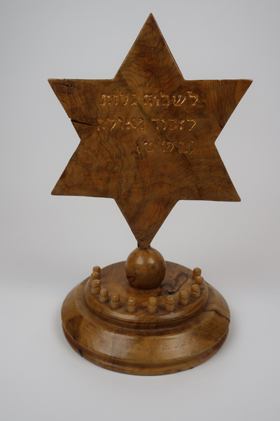 Davidster, hout, op sokkel. Op bovenkant van de voet, twaalf houten pinnen die de twaalf stammen van Israël moeten voorstellen. De onderste punt van de ster rust op een bal. Op de voorkant een goudkleurige Hebreeuwse inscriptie. Op de achterkant inscriptie: vergeten is ballingschap / herinneren verlossing / {Ba'al sjem Tov). Gesigneerd en gedateerd onderkant.