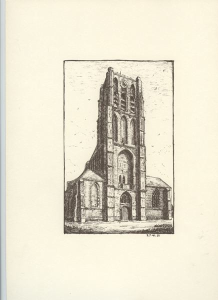 Reproductie met gezicht op de toren van de Sint Catharijnekerk anno 1931 binnen zwart kader.
