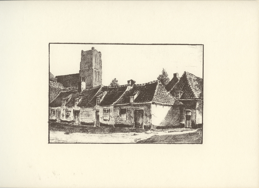 Reproductie met gezicht op de Langestraat te Brielle in 1930 in zwarte kader. Op achterkant opschrift.