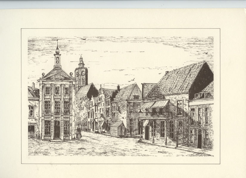 Reproductie met gezicht op de Markt te Brielle anno 1850. Afbeelding in zwarte kader. Op achterkant opschrift.