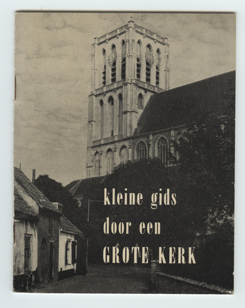 Gids getiteld: kleine gids door een GROTE KERK, zijnde de Sint Catharijnekerk. In de gids informatie over de sluitsteen met Catharina va Alexandrië, Coppelstockraam, geus Hans Onversaeght, gedenktafel, hoofdingang, graven en zerken, Gildebord Kleermakers, Willem van Oranje, gewelfschilderingen, Gildebord bouwlieden, Liturgisch centrum, Rochus Meeuwiszoon, Angelus Merula, klokken en carillon, orgel, Tien Gebodenbord, Gildebord kooplieden, wijwaterbakje, ...